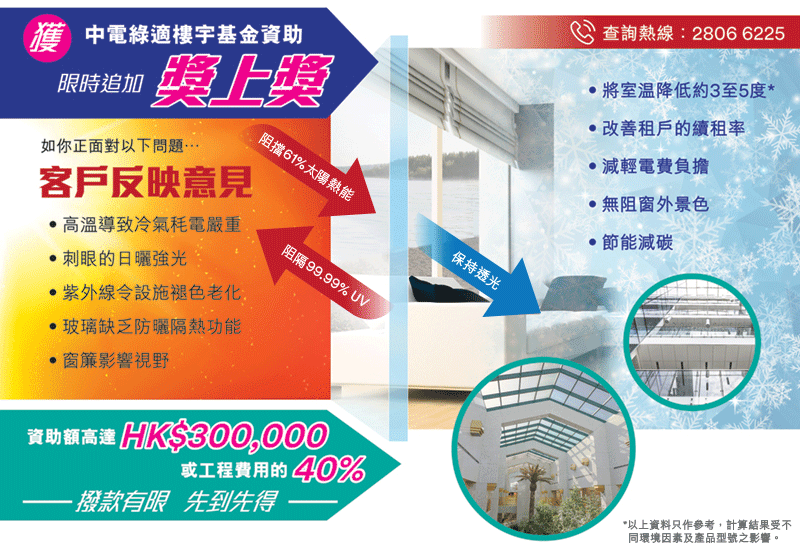 裝貼3M™防曬隔熱玻璃薄膜 (參閱#1),可申請中電的「綠適樓宇基金」資助,限時追加獎上獎!