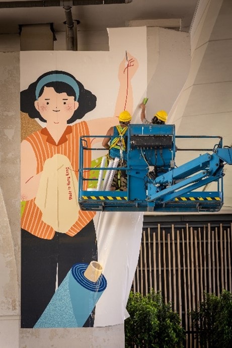製作過程長達3個半月,共分為:度尺、移除舊壁畫、平整橋墩表面,實地效果測試和現場施工等五個階段。梁表示當中最大的挑戰在於該公共空間熱鬧非常,他要和不同政府部門、施工單位和場地負責人協調溝通,在確保不影響公眾活動和餐廳營運下仍能趕上項目進度,過程極具挑戰性,因此他們選用了非常耐用且易於裱裝和移除的3M™ 高質噴畫物料,以功能表現穩定的物料代替傳統手繪或油畫,來充分展示作品的細緻神髓。
